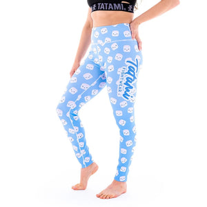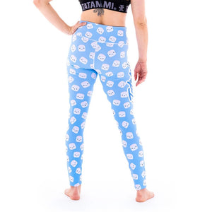 Light blue leggings covered in marshmallows with smiley faces.